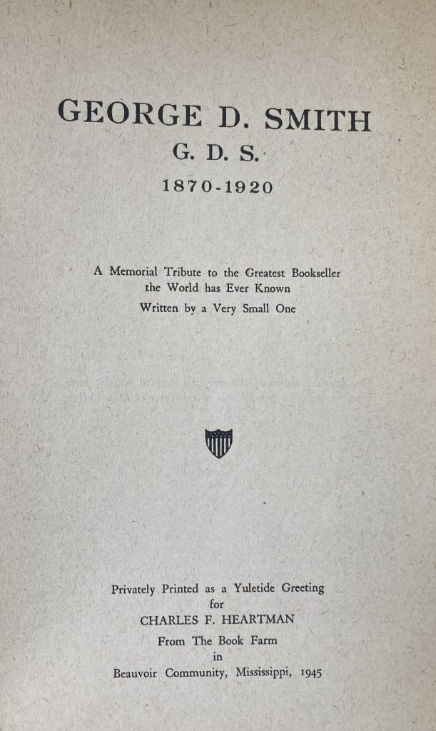 — Charles F. Heartman. George D. Smith. G. D. S. 1870-1920. A Memorial Tribute to the Greatest Bookseller the World has Ever Known. Written by a Very Small One. [Cover title : George D. Smith Gentleman Bookseller]. With two plates from photographs. [2], 31 pp.  Privately Printed as a Yuletide Greeting for Charles F. Heartman. From the Book Farm in Beauvoir Community, Mississippi, 1945.